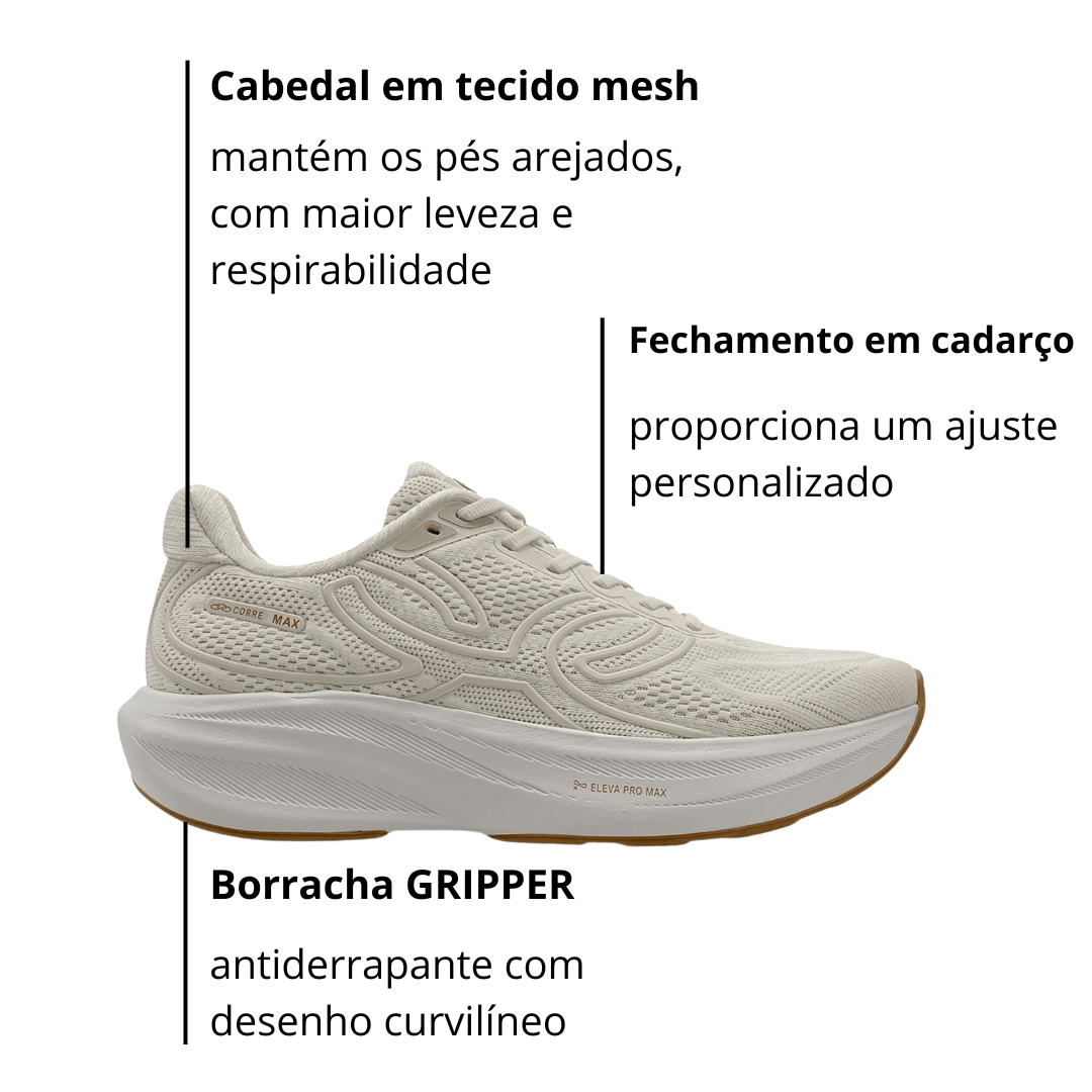 O Corre Max foi desenvolvido para oferecer uma experiência de corrida leve, macia e cheia de desempenho. Com design moderno e cabedal respirável, ele é perfeito para quem busca amortecimento superior, ajuste preciso e segurança a cada passo.