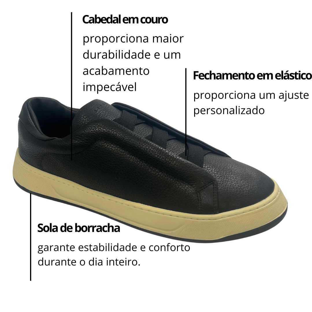 O modelo possui fechamento em elástico em formato de X, proporcionando calce fácil e um ajuste perfeito ao pé. O interior em forro dry fit oferece maior respirabilidade, enquanto o colarinho em couro eleva o conforto ao longo do uso diário. A palmilha macia e a sola de borracha garantem estabilidade e conforto durante o dia inteiro.