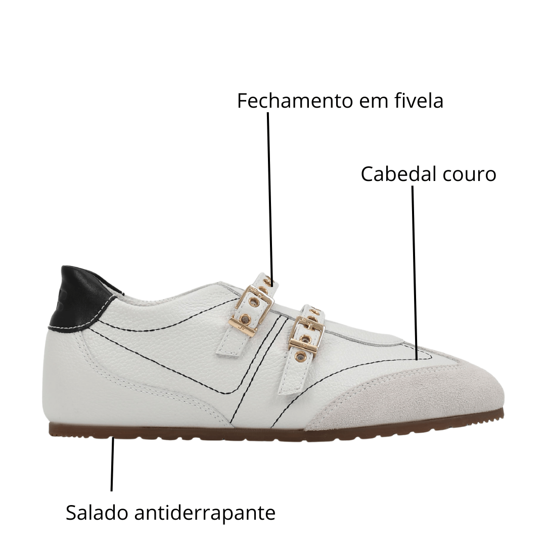 Cores: Branco e preto, com detalhe em camurça cinza no frontal.