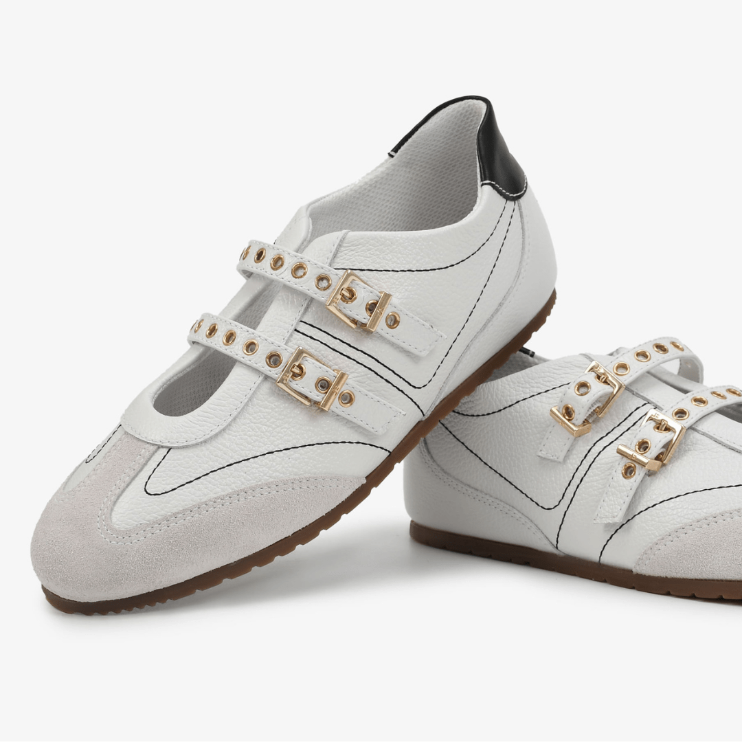 Fechamento por tiras duplas com ilhoses dourados e fivelas metálicas douradas, reforçando o toque sofisticado da marca.