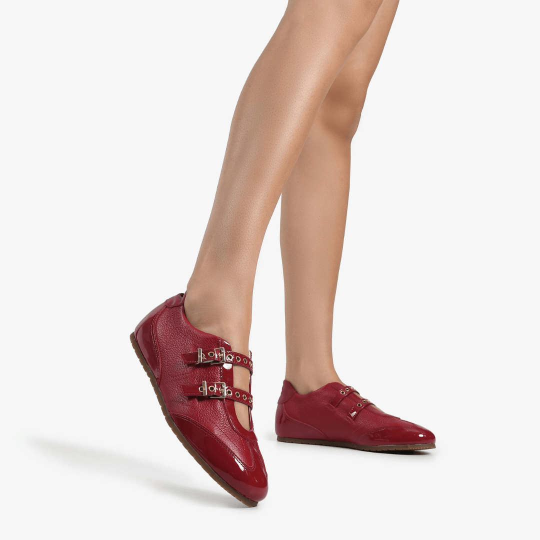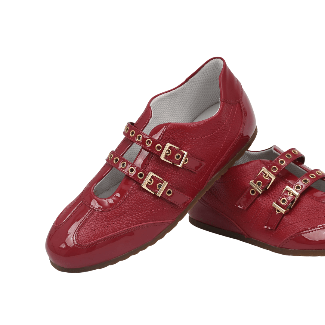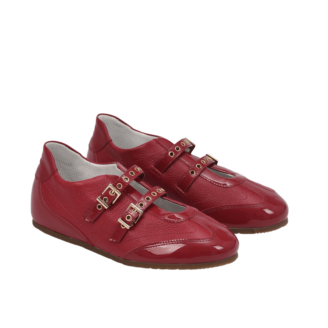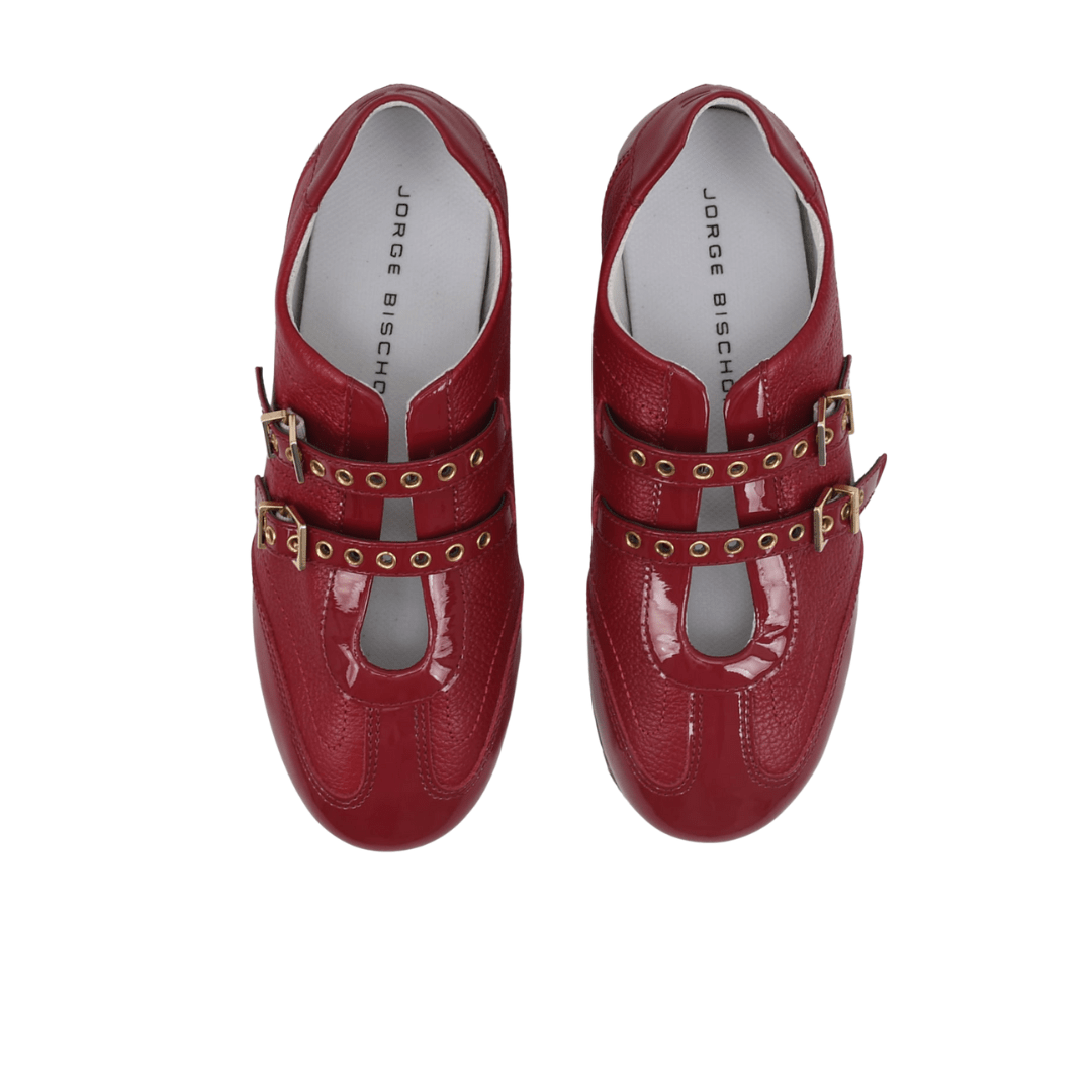 Bordas frontais, tiras de fechamento e bico em couro verniz vermelho, criando contraste refinado.